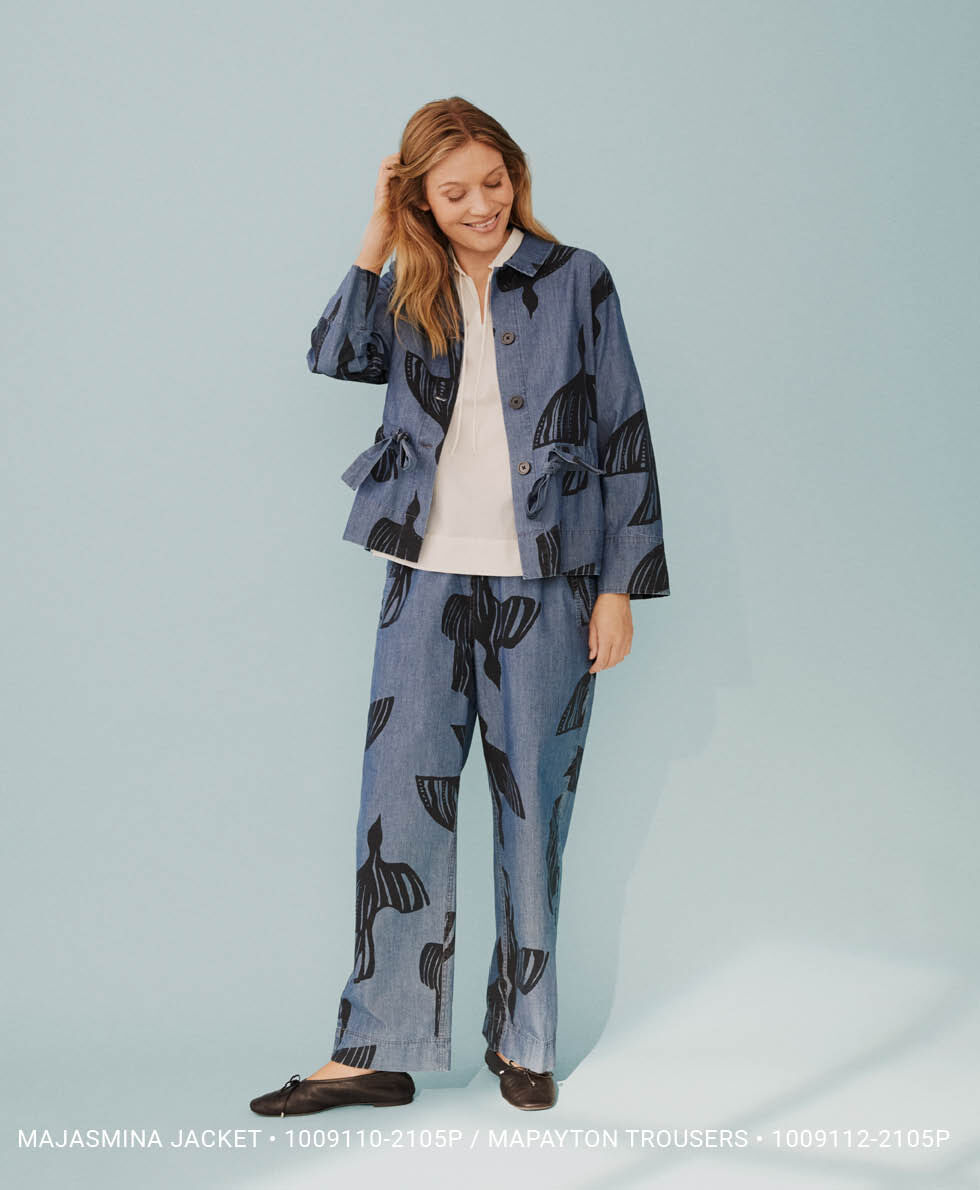 Create a cool, feminine and effortless look with a matching jacket and trousers. Take this elegant and casual set in soft and comfortable denim, decorated with artistic and poetic bird prints. Wear it together or separately for stylish looks with plenty of personality.