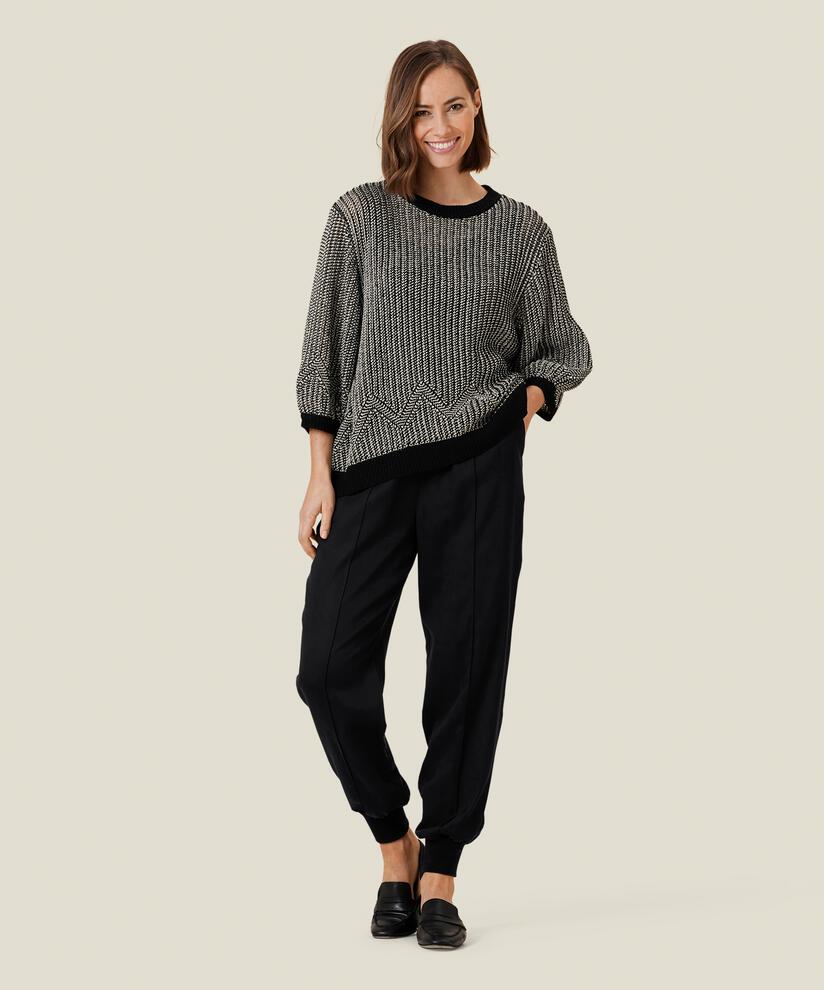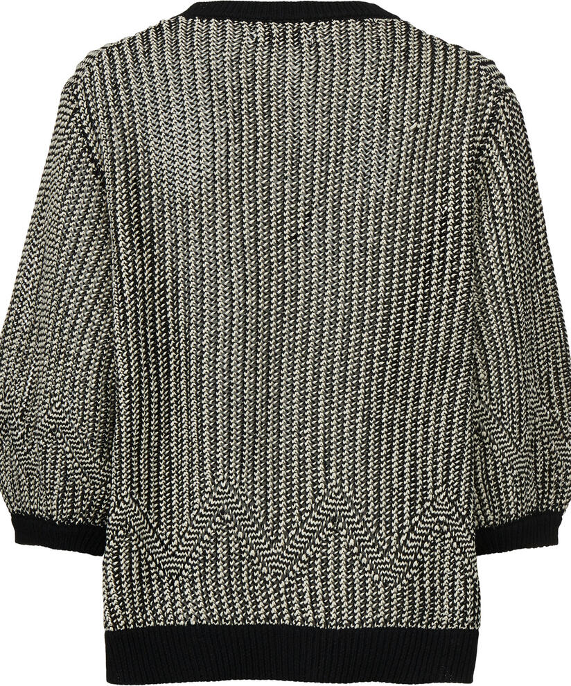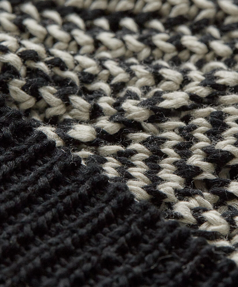 It is loosely knitted in soft cotton with a zigzag pattern and a black ribbed trim for a stunning contrast.