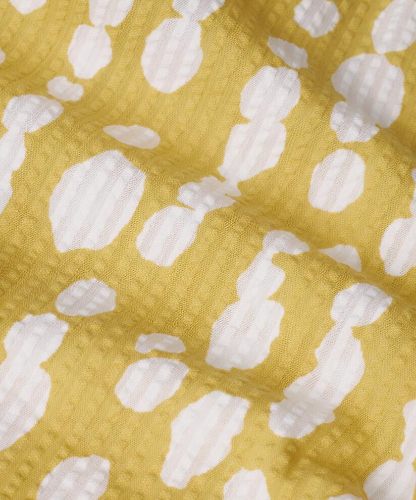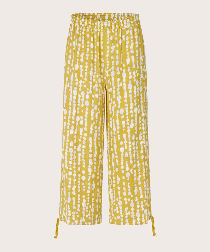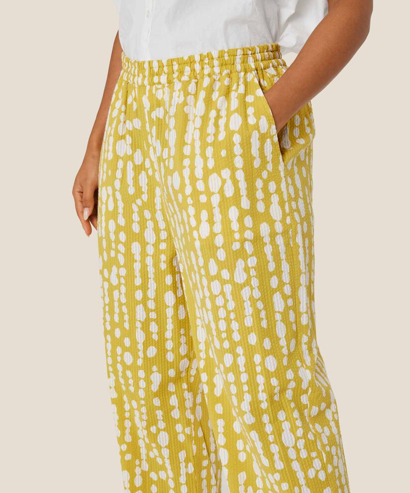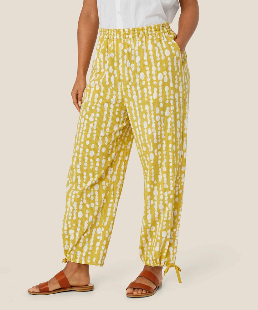 Embrace the feeling of summer with these sunshine yellow trousers with white polka dots. The trousers have a relaxed fit with an elasticated waistband, and the soft seersucker cotton gives a lovely texture while being light and airy to wear. The trousers have plenty of width in the legs with feminine drawstrings at the hem. Style it with our matching top or shirt for a complete summer look.